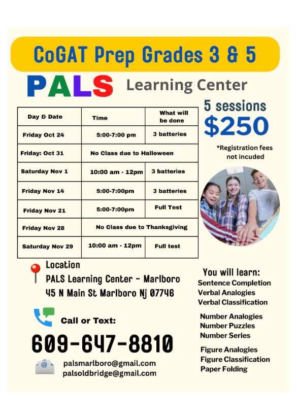 The CoGAT (Cognitive Abilities Test) plays an important role in placement for C-Level and Honors Programs in Marlboro Township School District. Our CoGAT Preparation Program helps students strengthen the skills and reasoning abilities needed to perform confidently on this assessment.